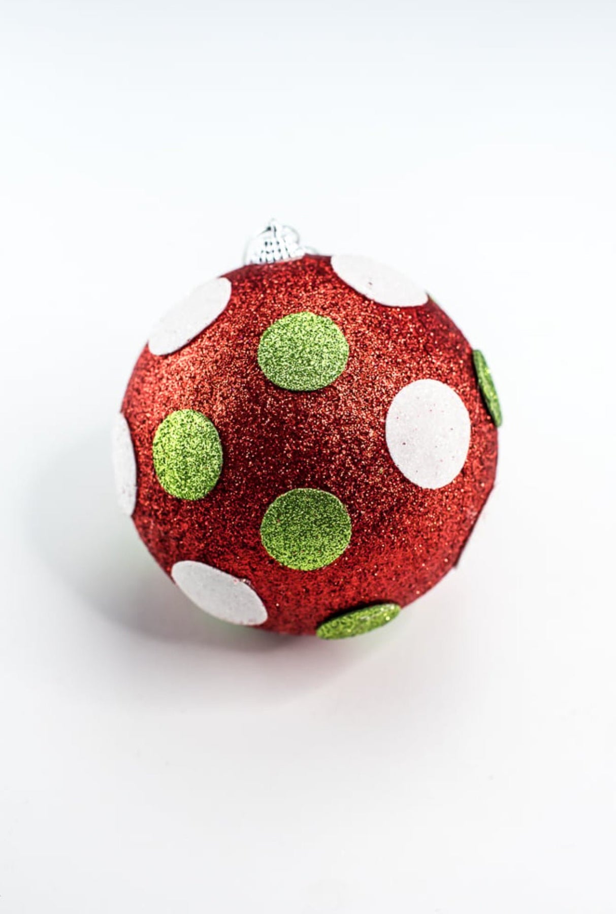This classic ball ornament boasts a vibrant red sparkle and is adorned with white and green polka dots. This is perfect for adding a pop of color to your holiday tree.