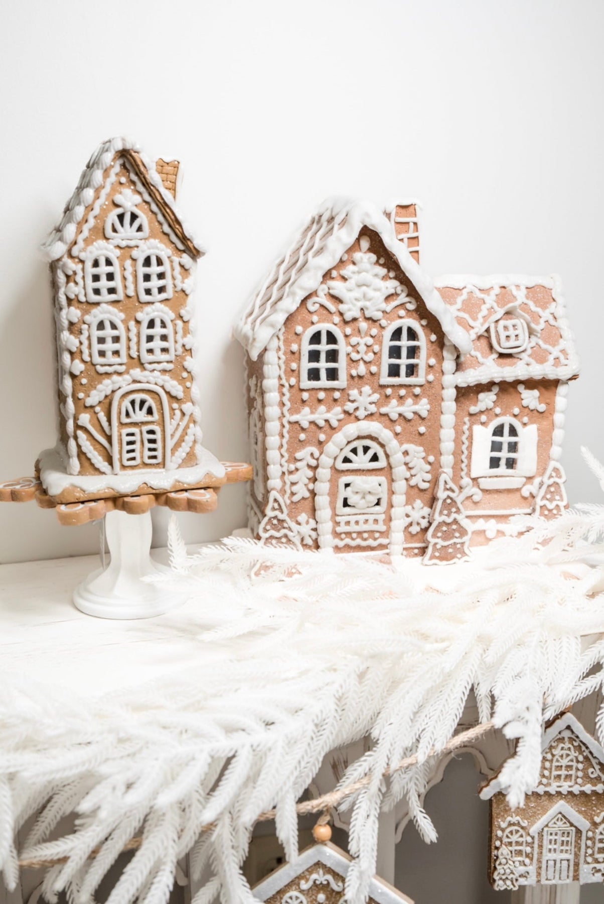 Compliment your gingerbread village or use anywhere throughout your holiday sweets decor. Set of two Raz resin gingerbread risers. Two risers included