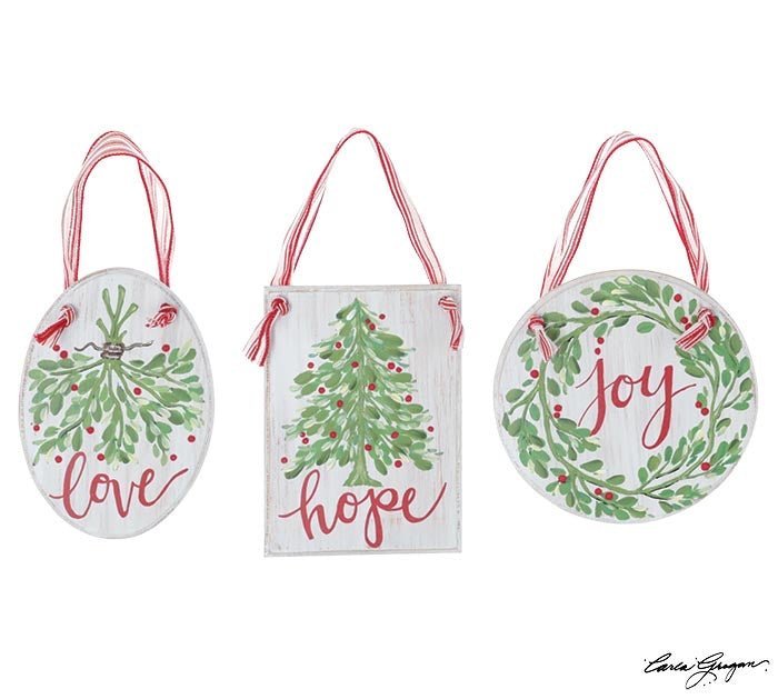 Distressed white ornament with assorted designs and messages including a ribbon hanger. Assortment includes one of each design; Christmas tree with "Hope" message, Mistletoe with "Love" message, and Wreath with "Joy" message.