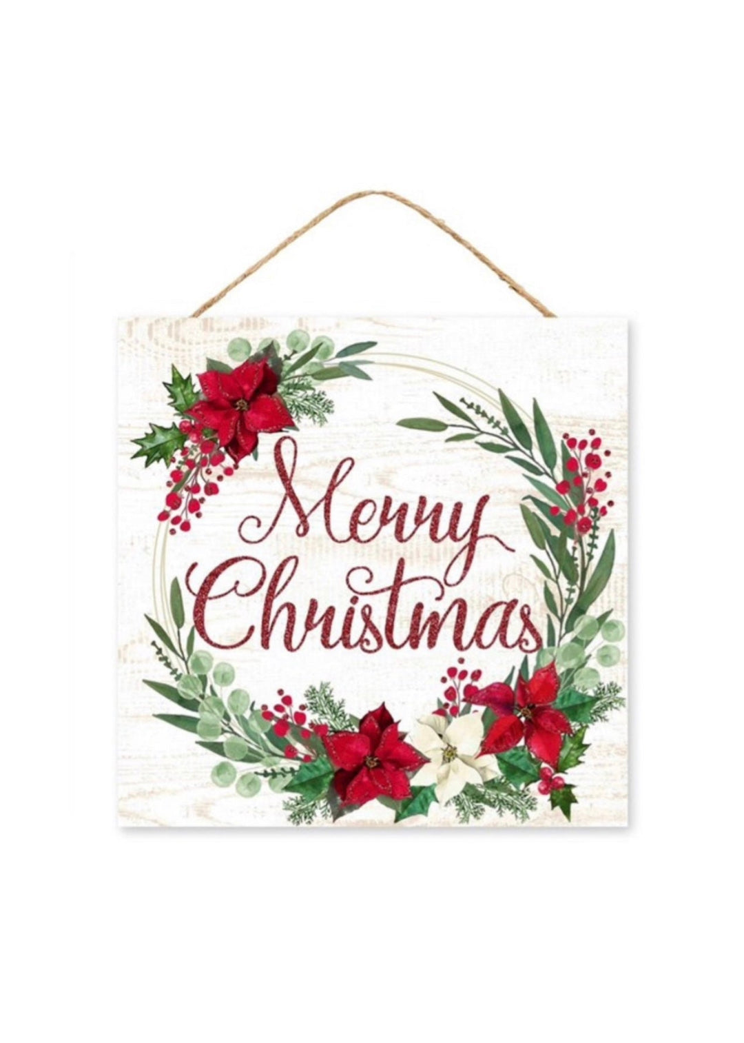 Merry Christmas sign with poinsettia and greenery