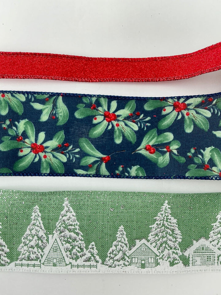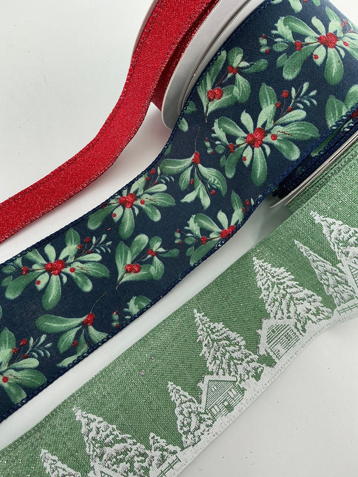 Navy blue greenery, red, and green bow bundle - set of coordinating ribbons hand picked by our staff for easy DIY bow making