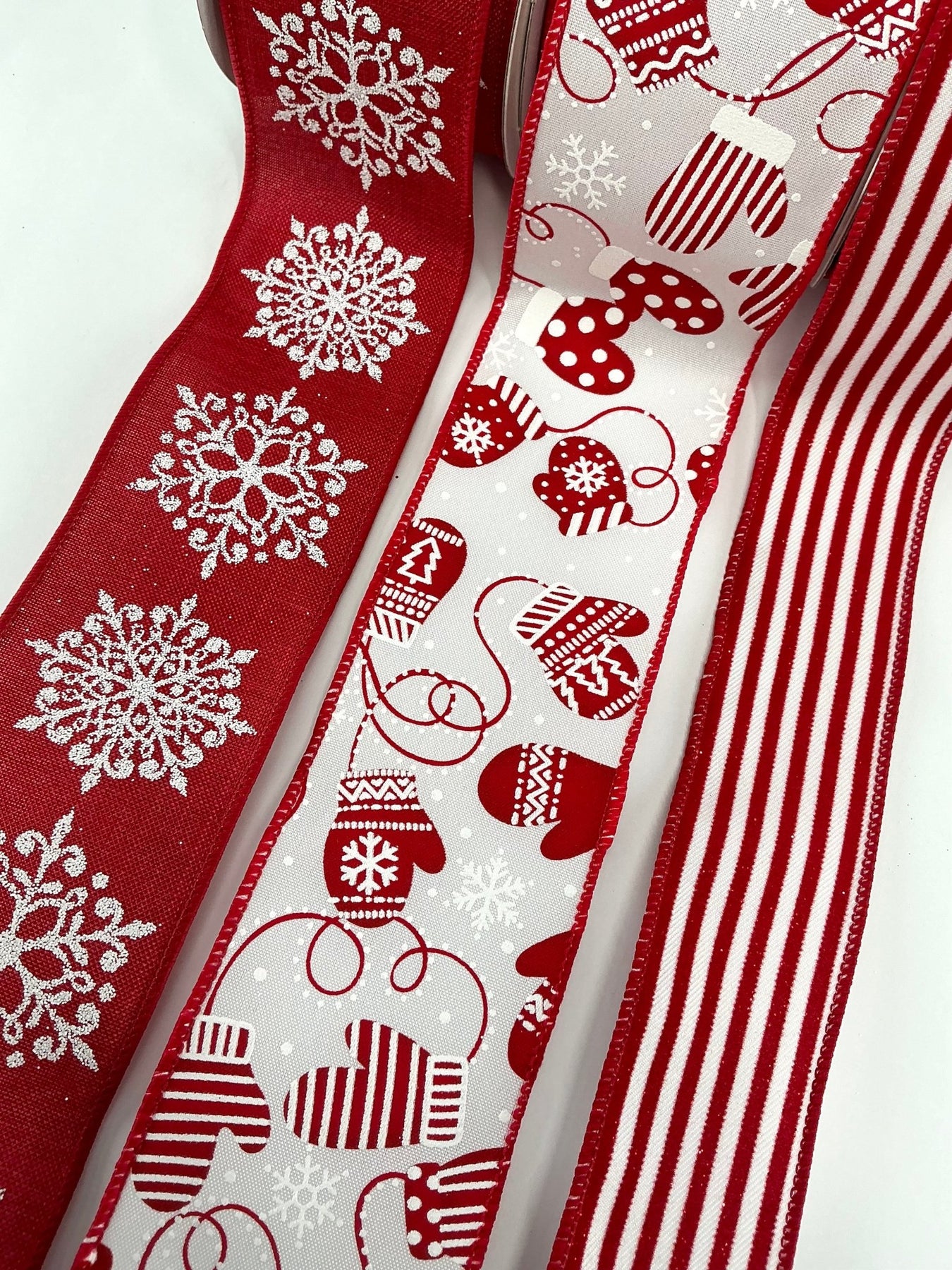 Snowy mittens red and white bow bundle - set of coordinating ribbons hand picked by our staff for easy DIY bow making
