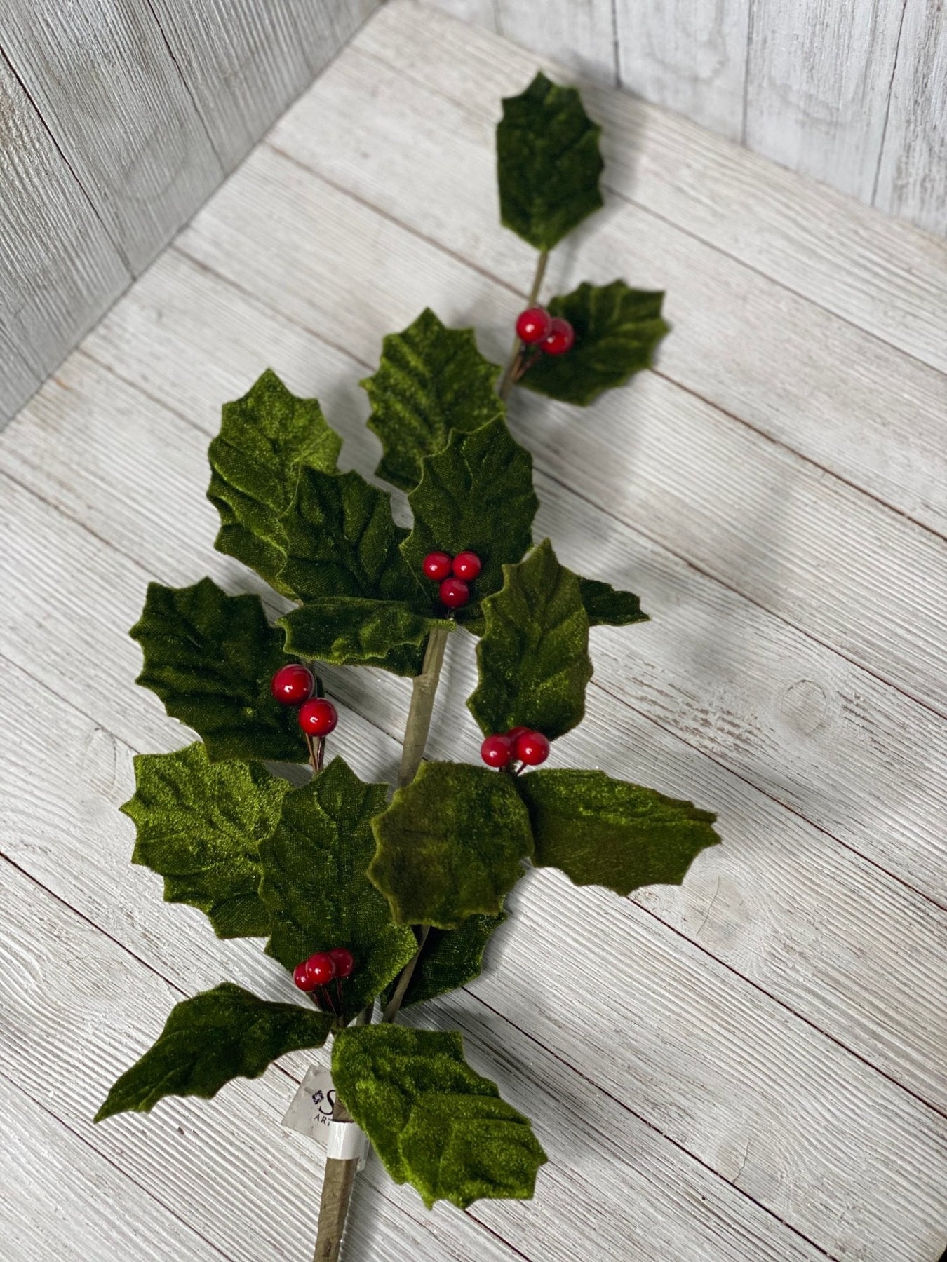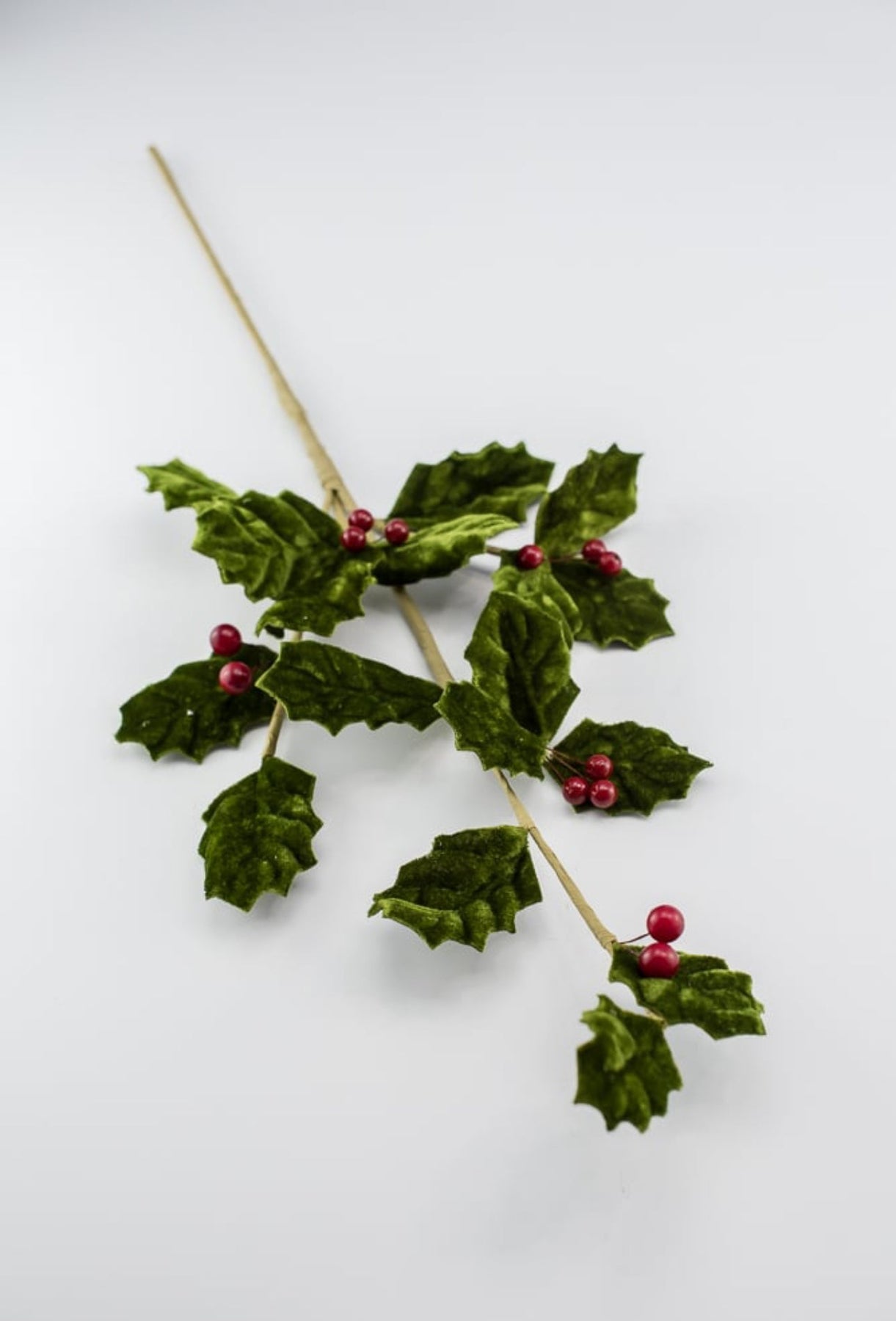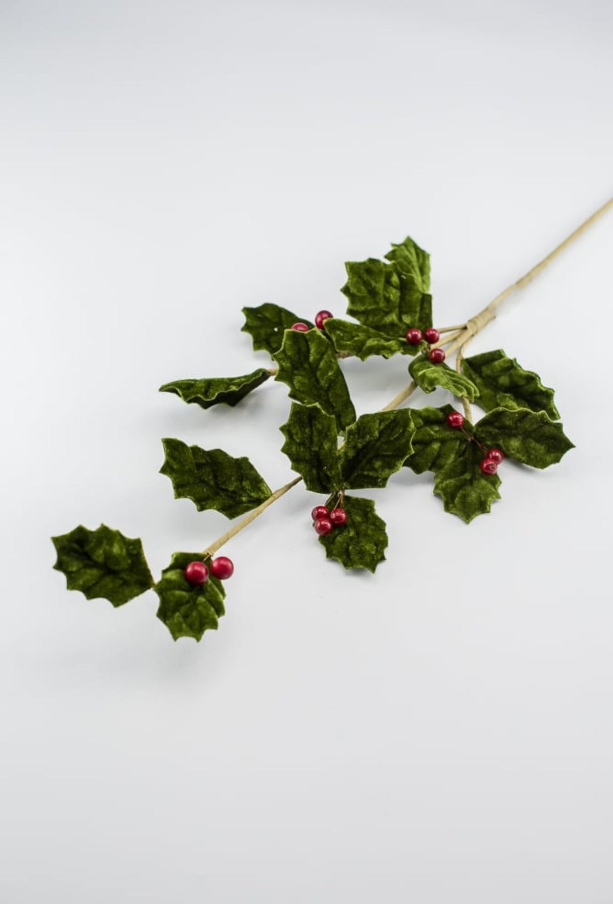 Green velvet holly. Each leaf is wired for bending and shaping.