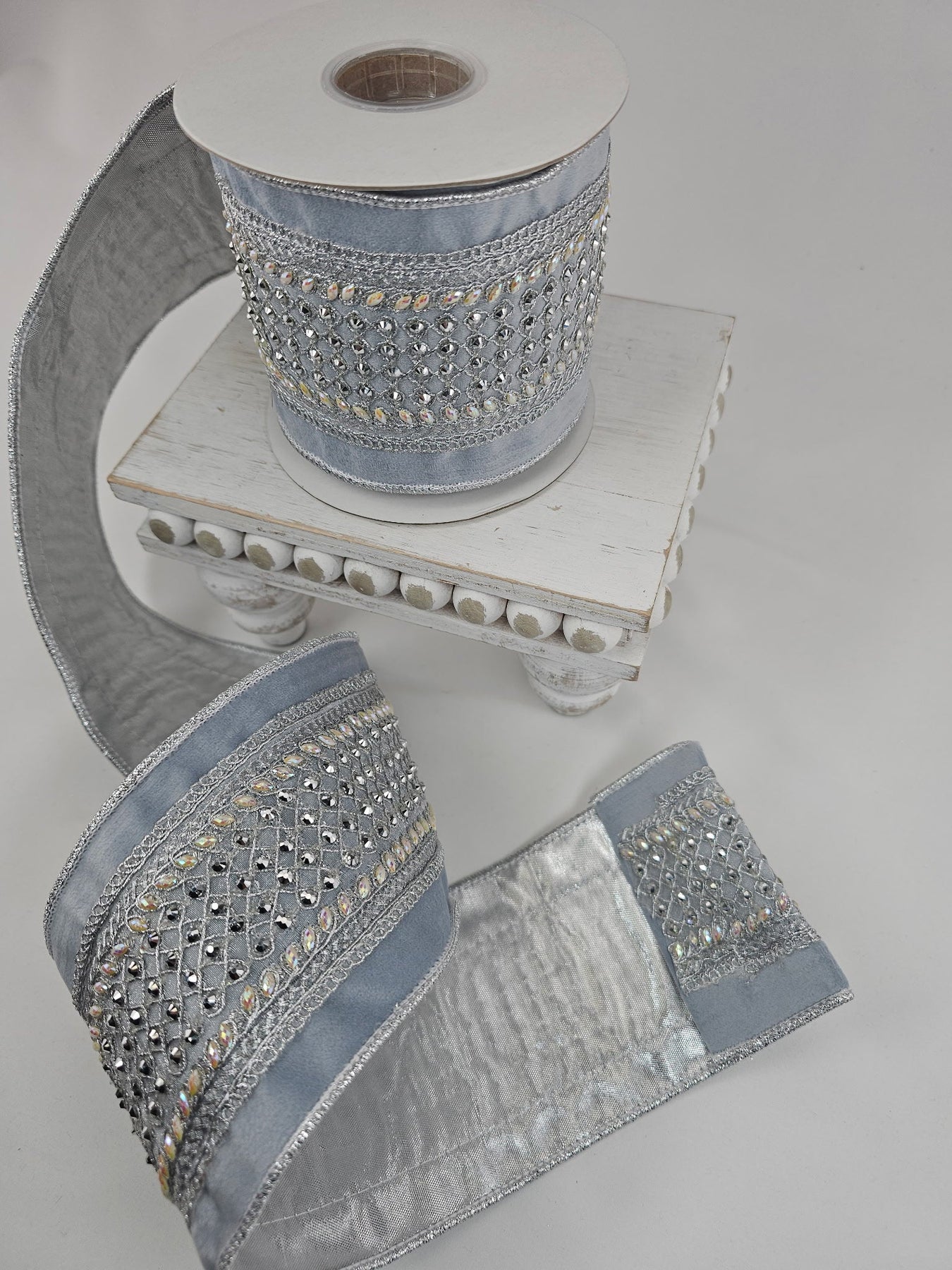 Faux Crystal Trim On Blue Velvet Ribbon, 4" x 5 Yards Blue