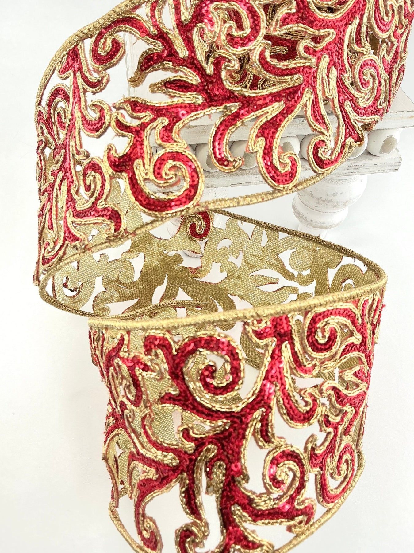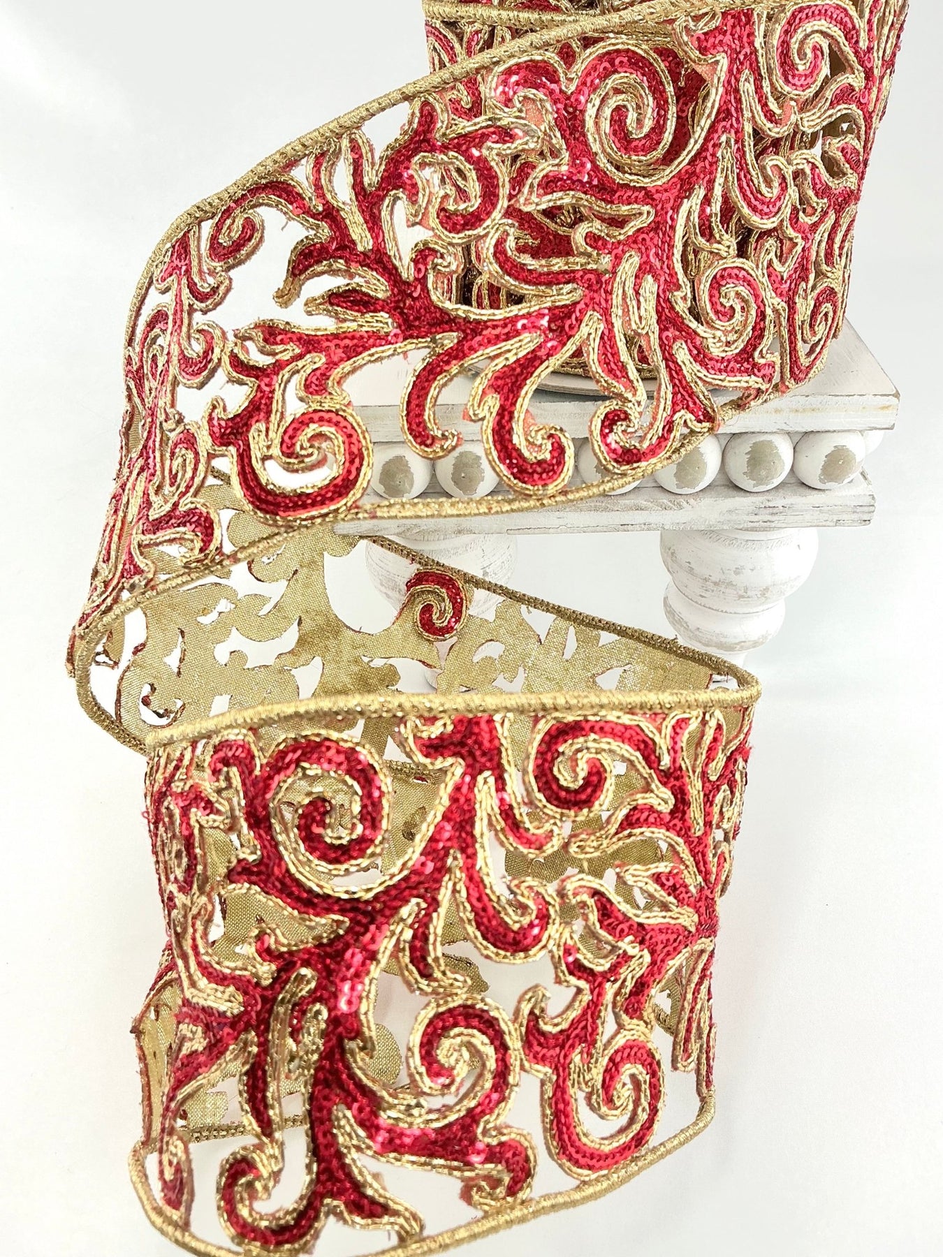 Farrisilk red sequin acanthus wired ribbon - 4” - Greenery Marketwired ribbonRK745 - 02
