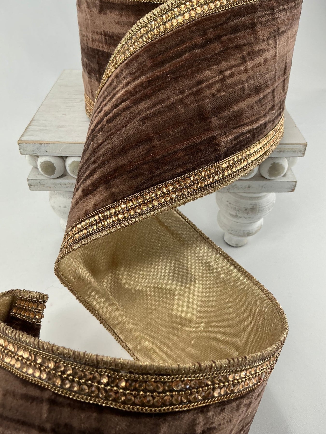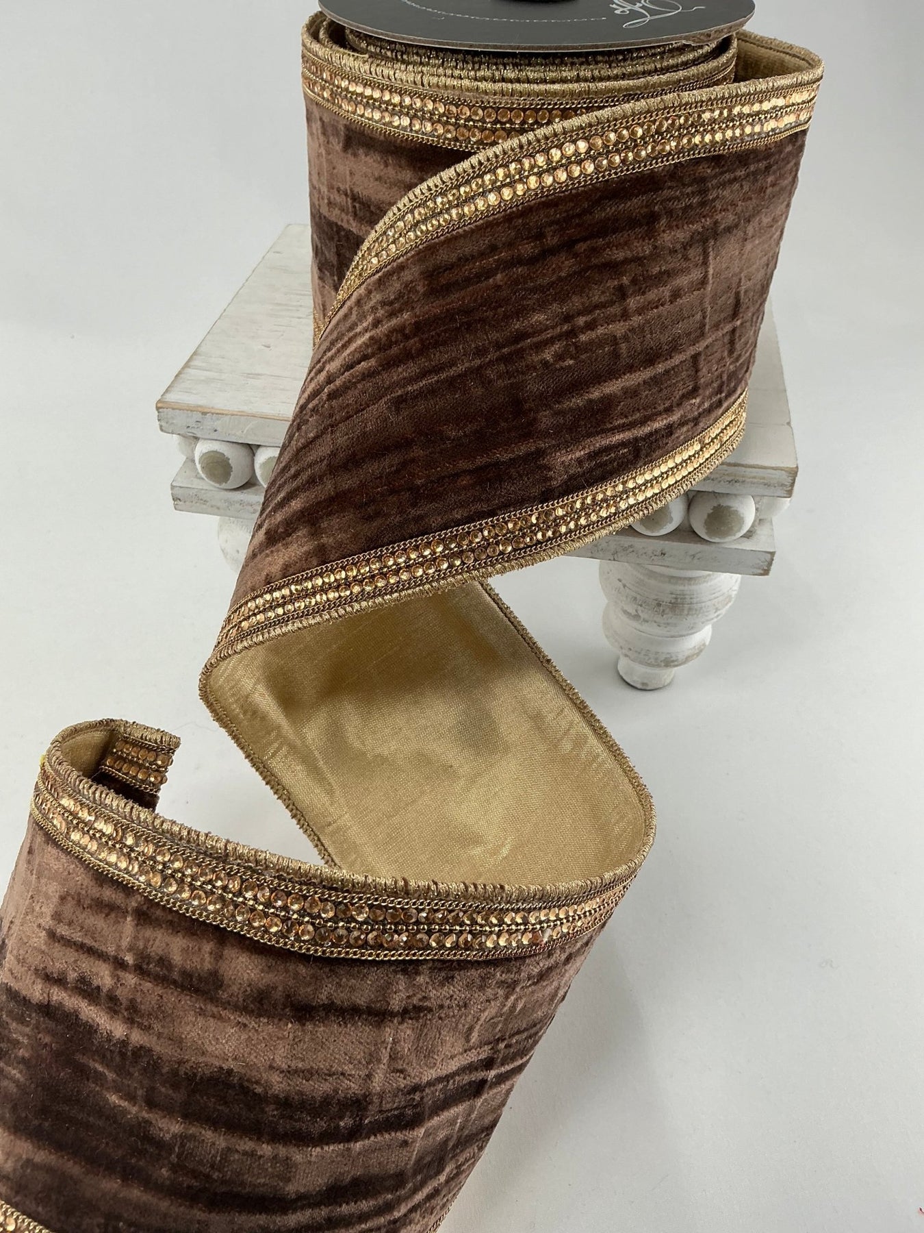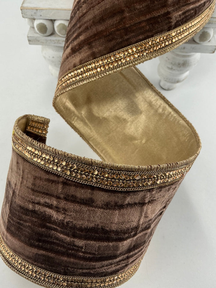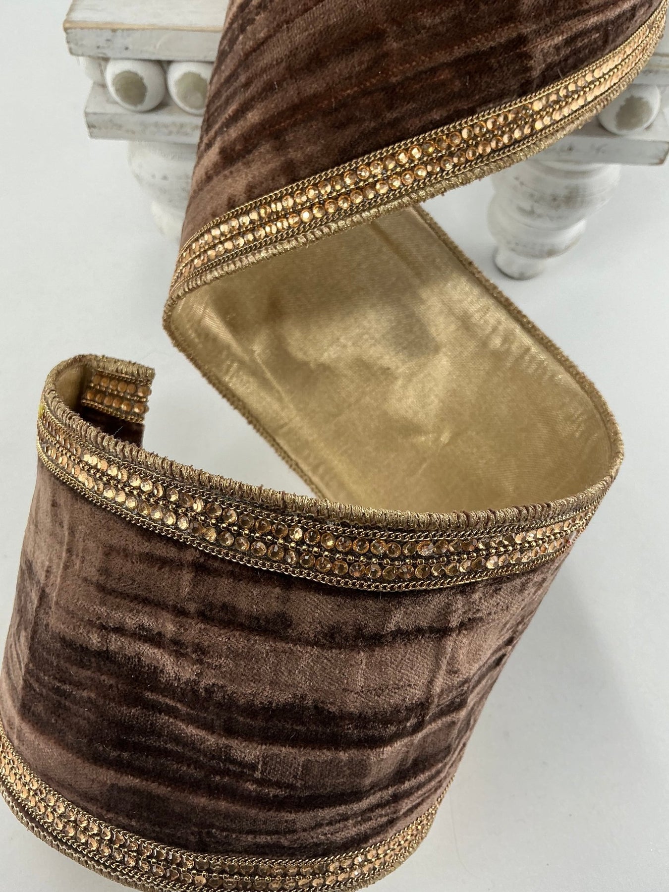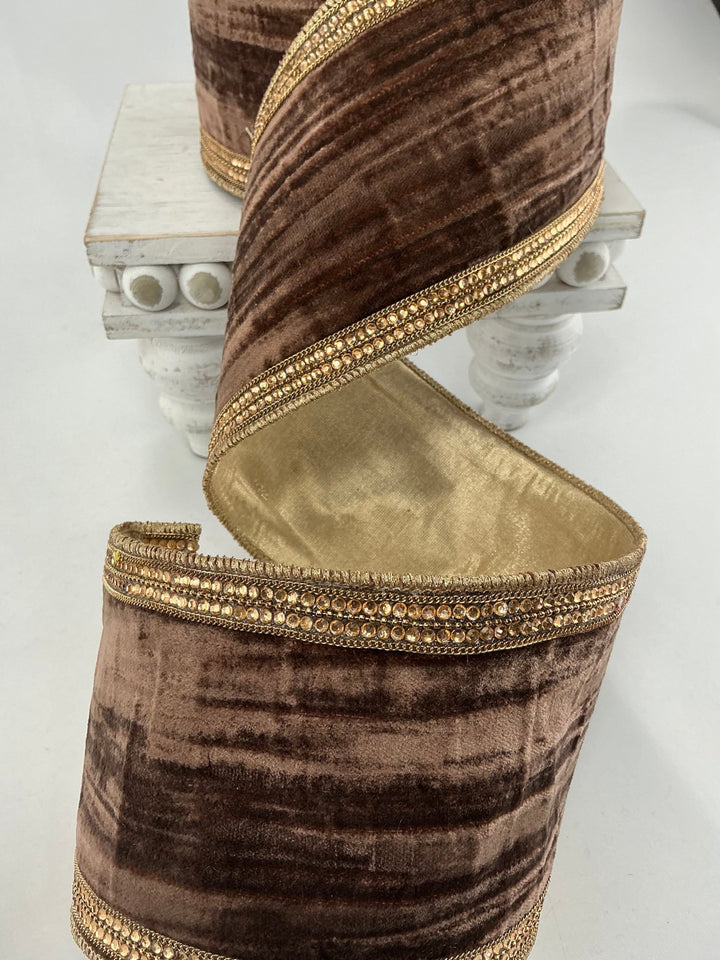 Pecan velvet 4” wired ribbon. Ribbon is constructed with a thick wired edge and secondary fabric to provide excellent shape.