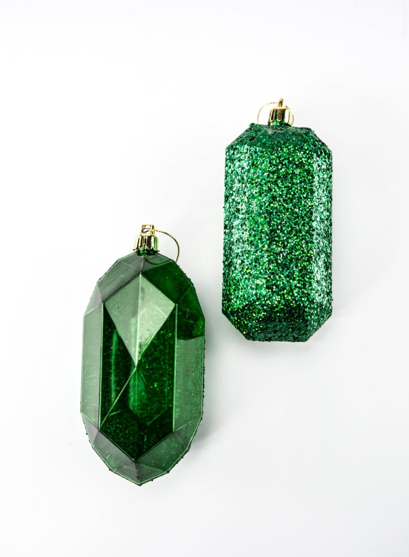 2 Asst 5.25"L laser glitter emerald green gem ornaments