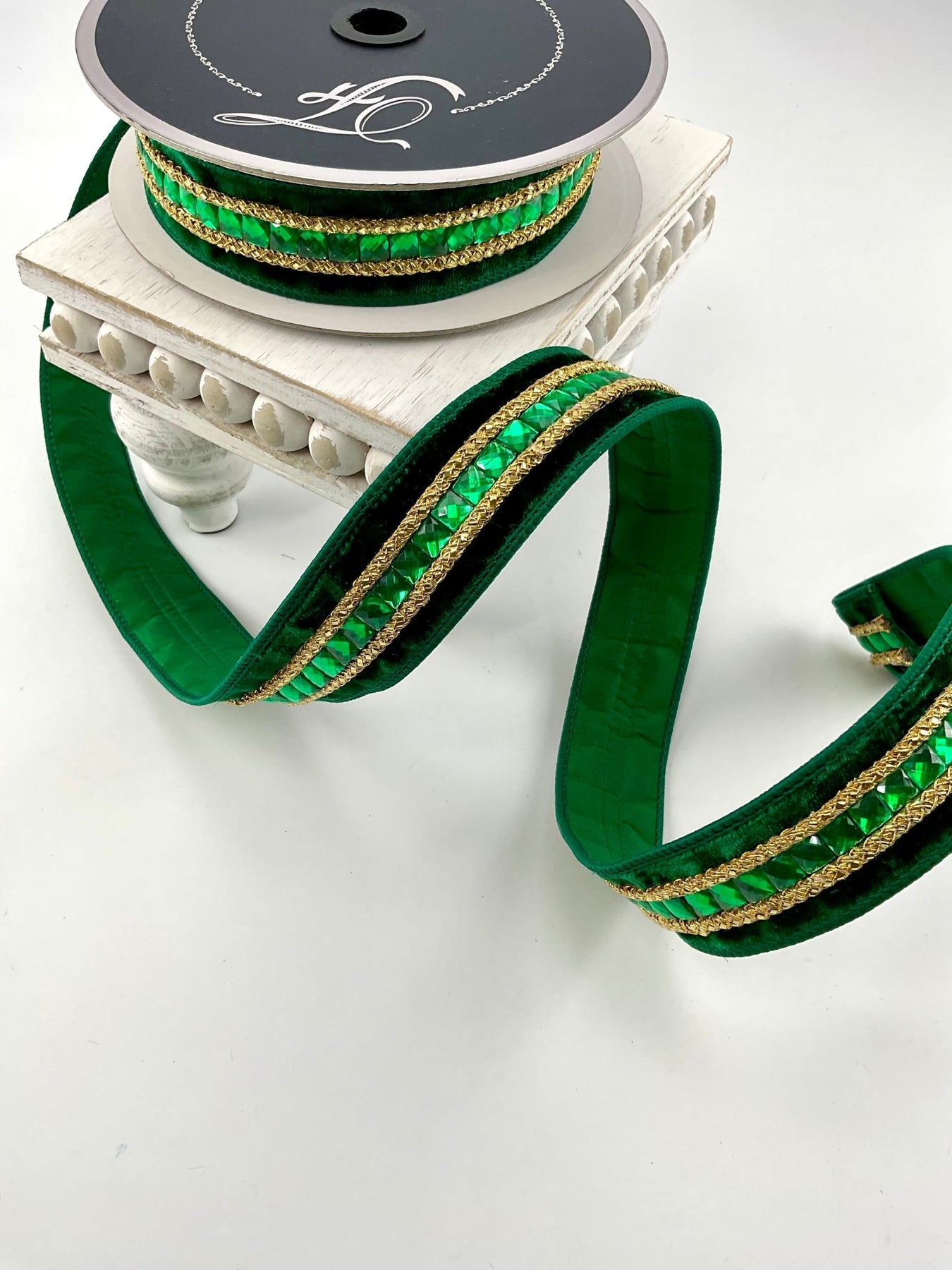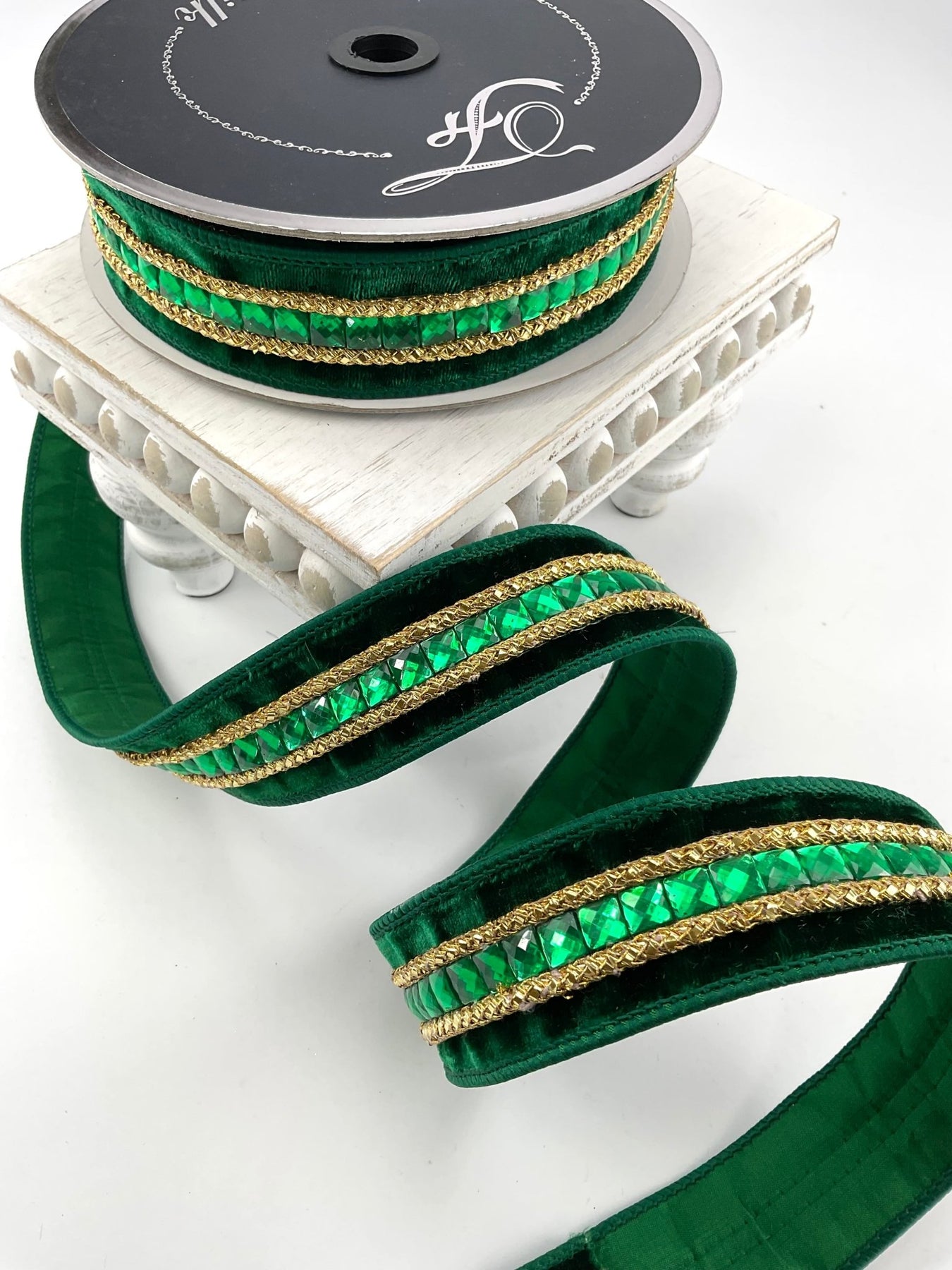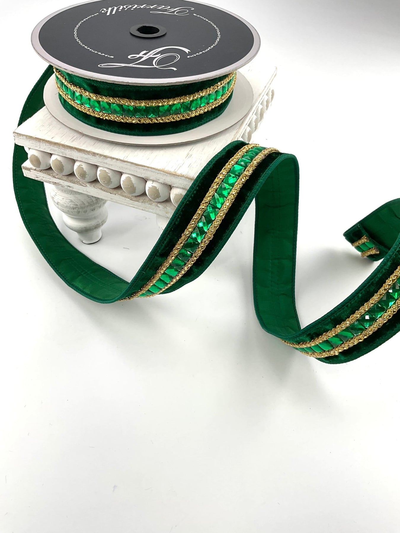 Emerald green velvet jewelry gemstones 1.5” farrisilk wired ribbon