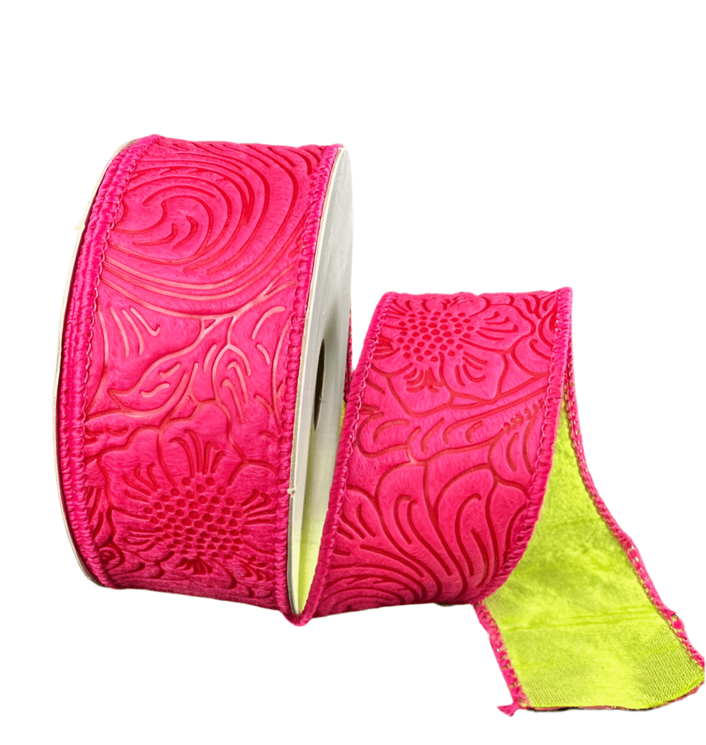 Bright pink and green double sided embossed 1.5” wired ribbon